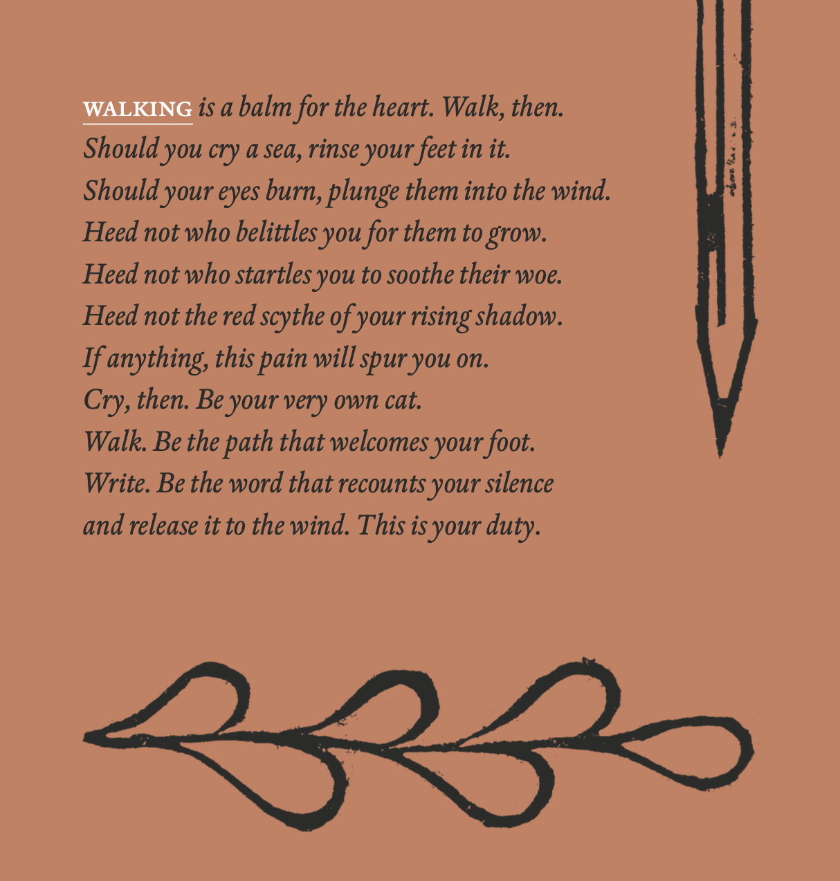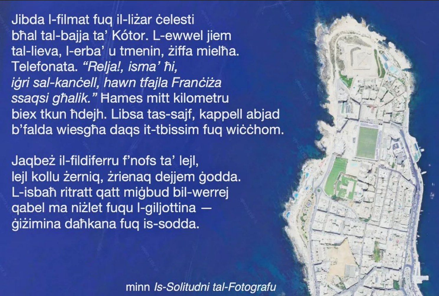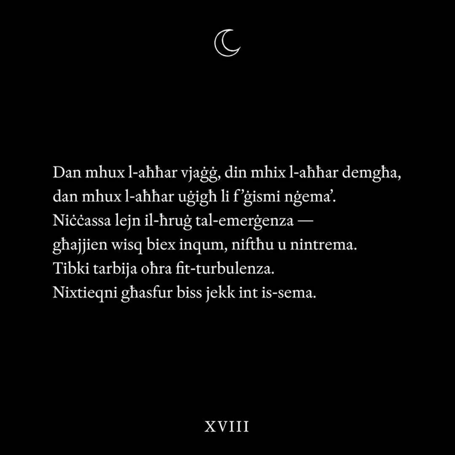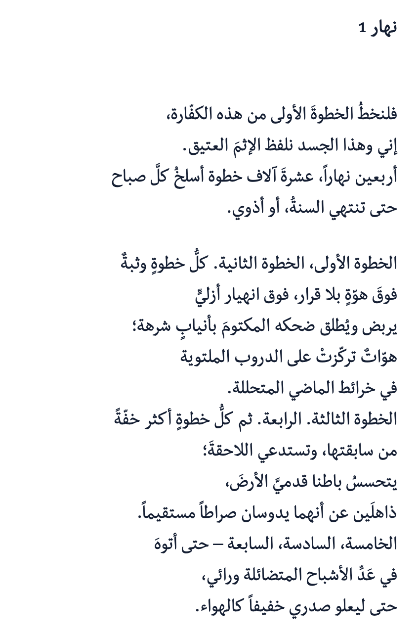 Erbgħin Jum (Forty Days, Ede, 2017) is a book-length poem on childhood trauma, depression, and walking as a process of healing. A brutally personal pilgrimage in the cartographies of the past, without compass or walking stick.