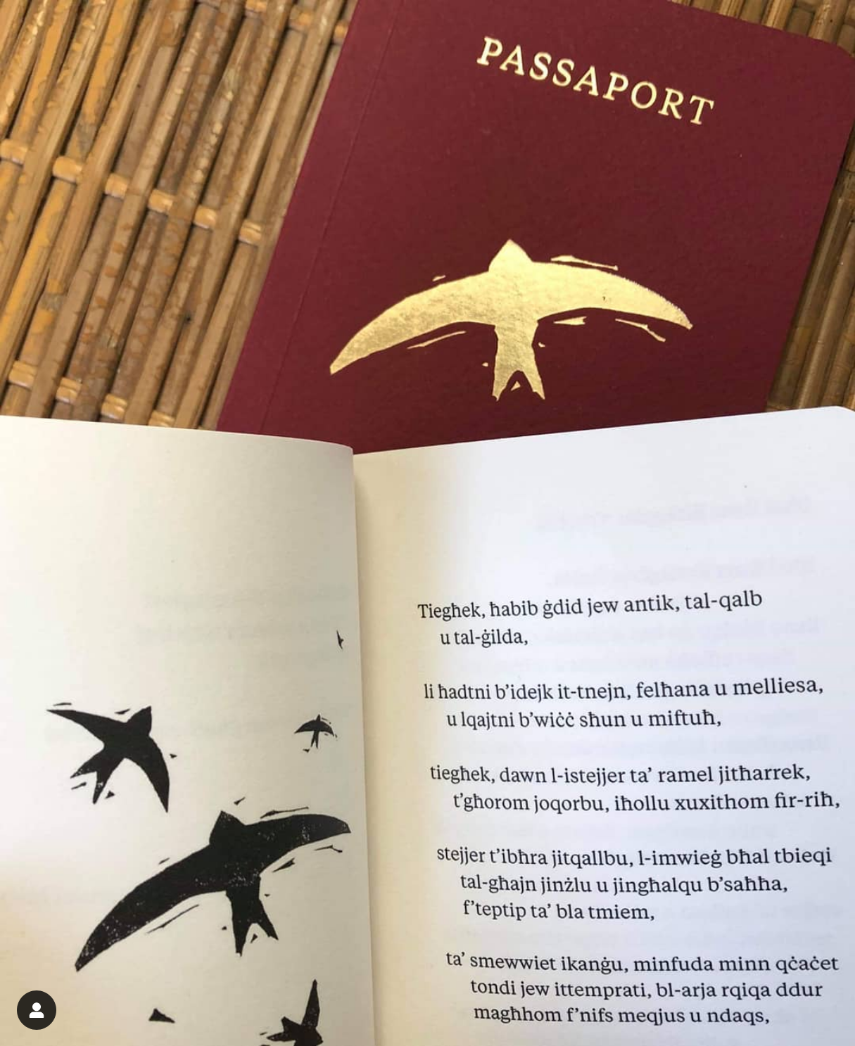 Passaport, a long poem printed in the form of an anti-passport for all peoples and all landscapes, has been published in over a dozen languages; adapted for the stage by theatre groups in Malta, France, Belgium, Luxembourg and Canada; and set to music in France, Italy and Australia.