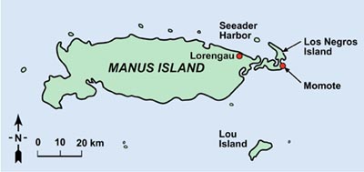 Manus Island, part of the Bismarck Archipelago, to the north-east of Papua New Guinea. 100 km by 30 km, population 50,321 as of the 2011 census. Known for its sea cucumbers (served as bêche de mer), the endemic emerald green snail (now an endangered species), and for its copper and gold deposits. In global focus, more recently, for hosting an “offshore refugee processing centre” on behalf of the Australian government. Having closed in 2003, the centre was re-opened in November 2012. To learn more about the conditions inside the centre, visit the website of Australian NGO ChilOut (as in CHILdren OUT of detention), or click here to watch an investigative report that goes inside the centre (ABC).