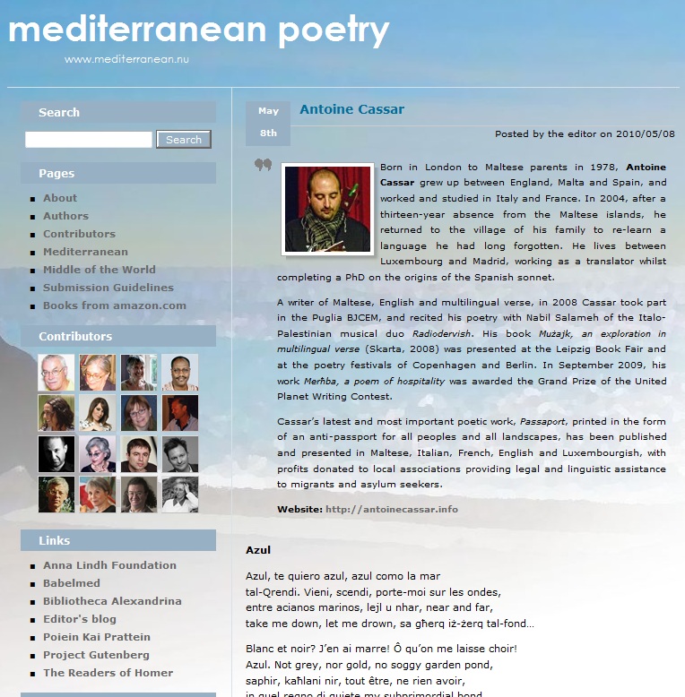 Ġiet ippubblikata saflaħħar il-ħarġa letterarja 2008 tar-rivista tal-Akkademja tal-Malti. Tinkludi l-poeżija tiegħi Jum ir-Riflessjoni (sfortunatament bl-istrofi maqsumin ħażin), kif ukoll traduzzjoni Maltija tal-poeżija Mediterran, ta’ Valerio Cruciani.