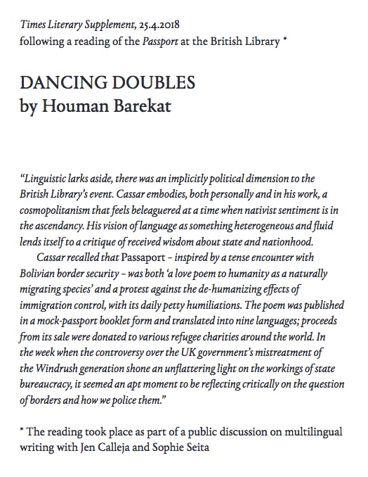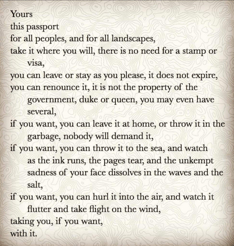 Passport is a protest poem denouncing an inventory of border absurdities and atrocities, nested inside a love poem to humanity as a naturally migrating species.