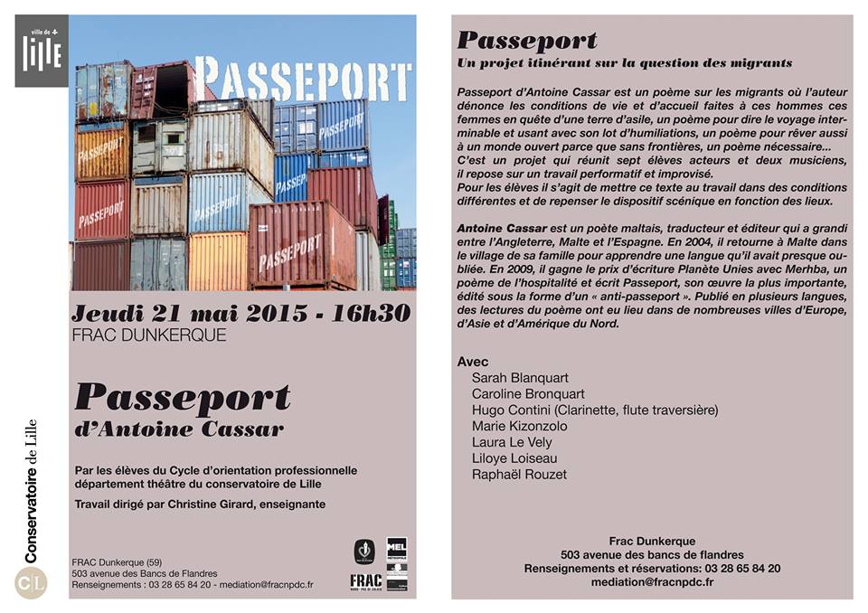In France, the Passeport (tr. Elizabeth Grech) has been set to electronic music by Compagnie Dautrescordes, and by multilingual choir Céchèki.